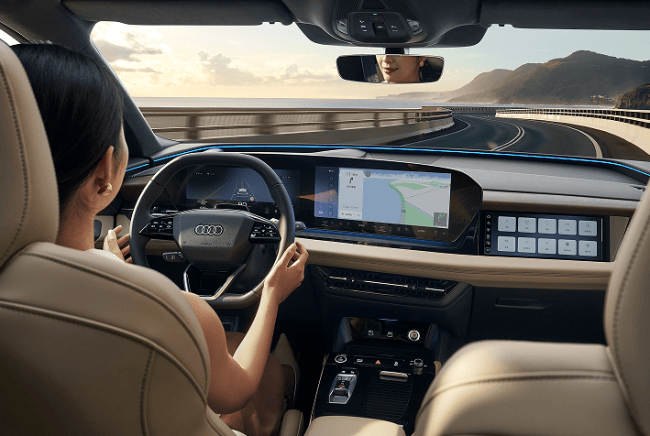 座舱空间与交互体验的优化,让一汽奥迪Q6L e-tron打造出沉浸式的出行氛围。座舱内由88英寸AR-HUD、11.9英寸OLED虚拟座舱、14.5英寸OLED中控屏、10.9英寸副驾隐私屏组成四屏交互系统,可与手机实现五屏联动,信息无缝流转。88英寸AR-HUD采用DLP技术,将导航箭头、车道指引与实际路况叠加呈现,佩戴墨镜也可清晰查看,有效减少驾驶分心。副驾屏搭载双e-cell隐私模式,行车时自动开启防窥功能,避免内容干扰驾驶员。车机内置75+生态应用,覆盖车载KTV、车载办公室、车载游戏厅等特色场景,高德定制导航支持车位级导航与交通灯倒计时功能。