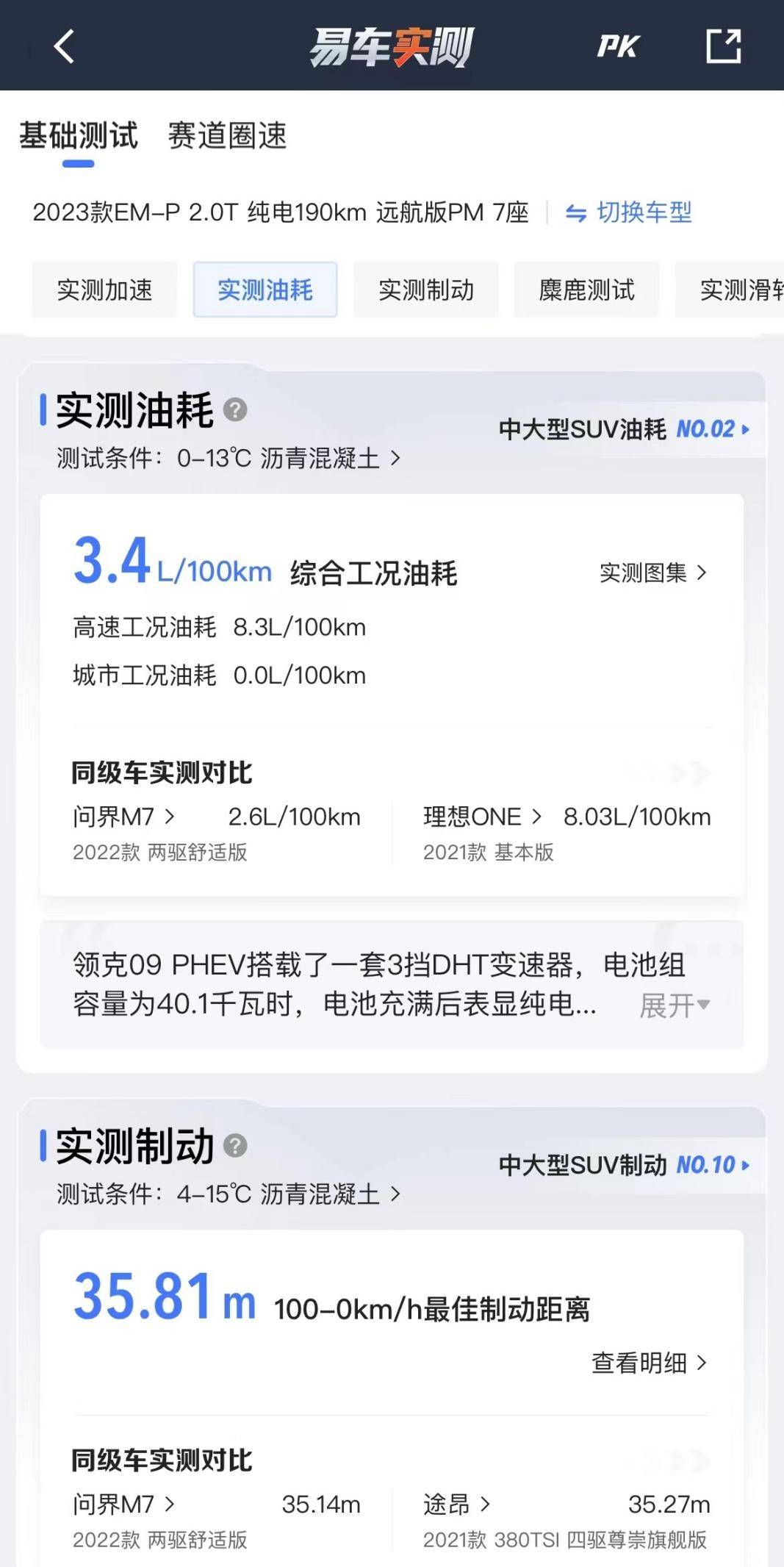 领克09 PHEV的百公里实测油耗则为3.4L,搭载的是一套3挡DHT变速器,综合油耗表现对于一台中大型SUV来说,还是相当不错的。