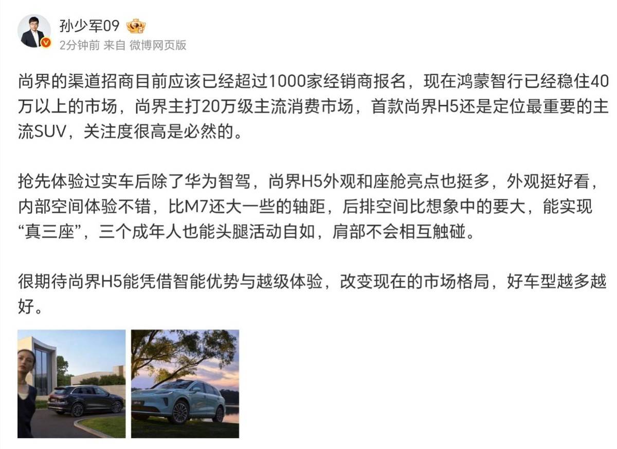 再者来看,如果要讨论智能化,消费天平一下会倾向新势力,甚至很多消费者会舍弃造型、车内空间,就为了追逐智能潮流。这里尚界就得感谢其他四“界”的托举了,鸿蒙座舱+ADS 4.0的组合现在已经拥有了广泛的认知度与接受度,在车价相近的基础上,这就是尚界H5的独特优势。而在智能领先的基础上,尚界H5又能给到用户无需将就、同级领先的空间体验。