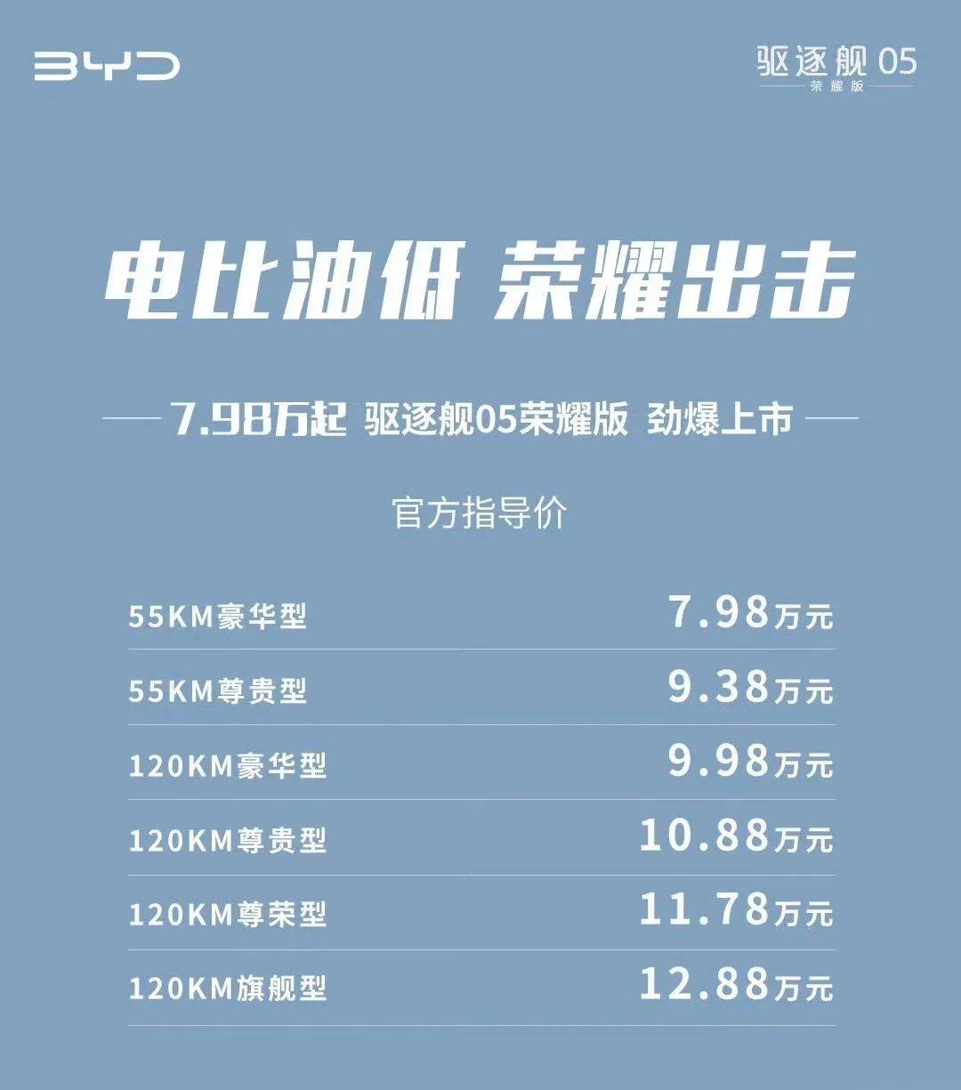 而驱逐舰05荣耀版则共推出6款车型,价格区间为7.98-12.88万元。