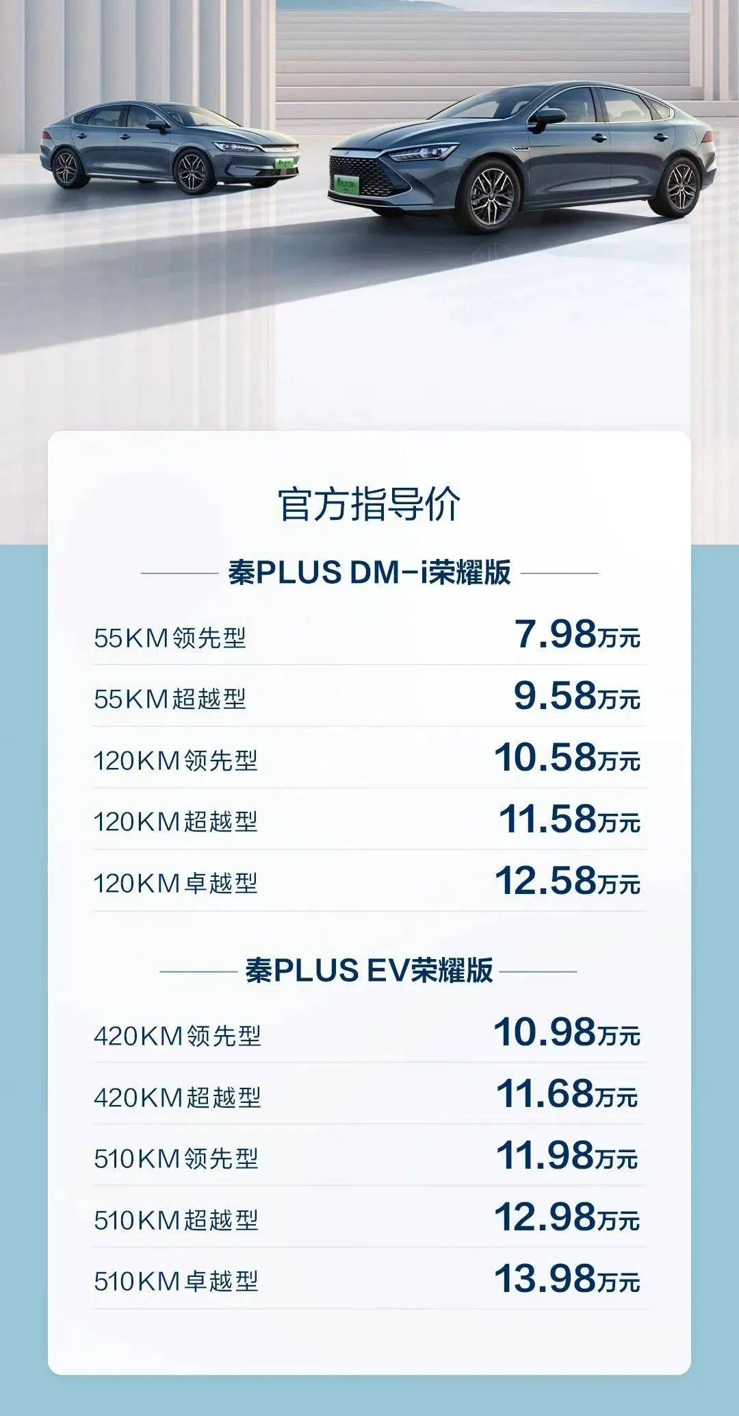 此次推出的车型中,秦PLUS荣耀版共推出5款DM-i版本车型,官方指导价7.98-12.58万元;EV版本同样为5款车型,官方指导价10.98-13.98万元。