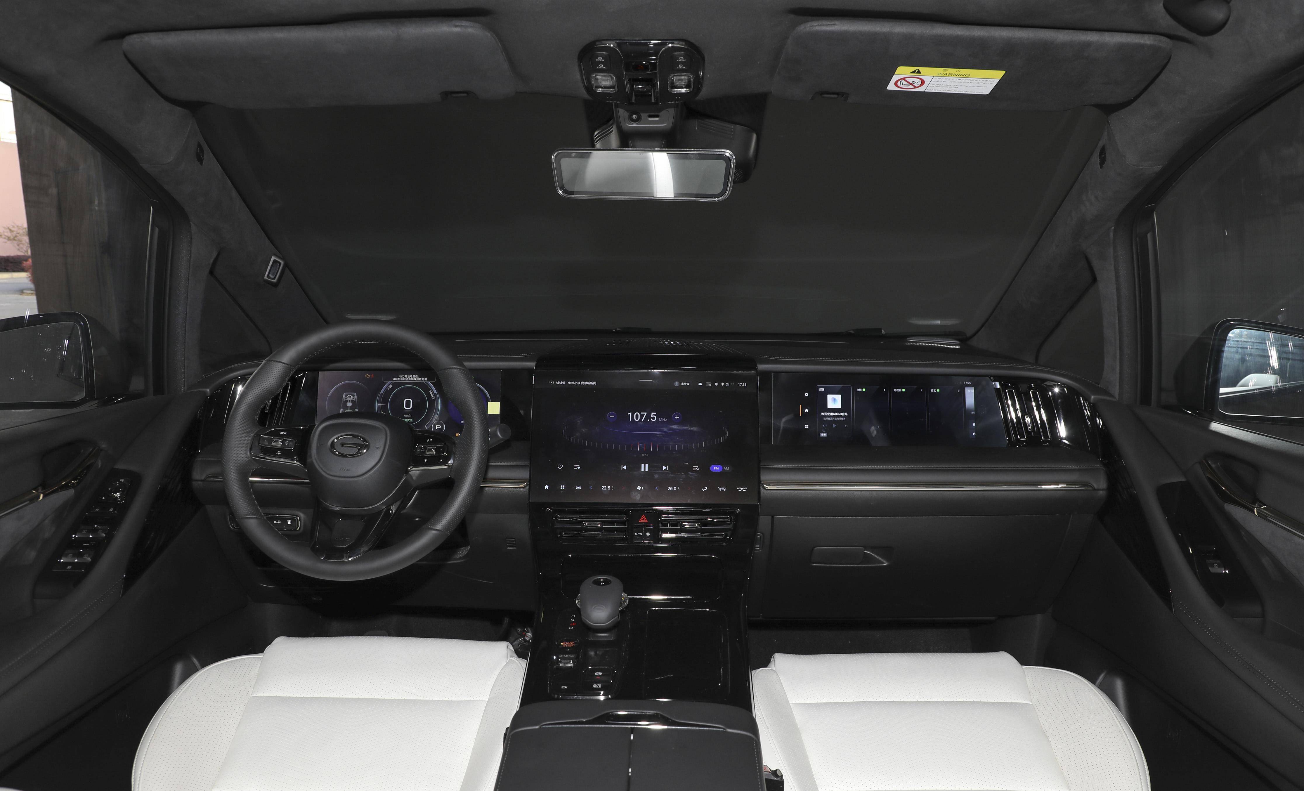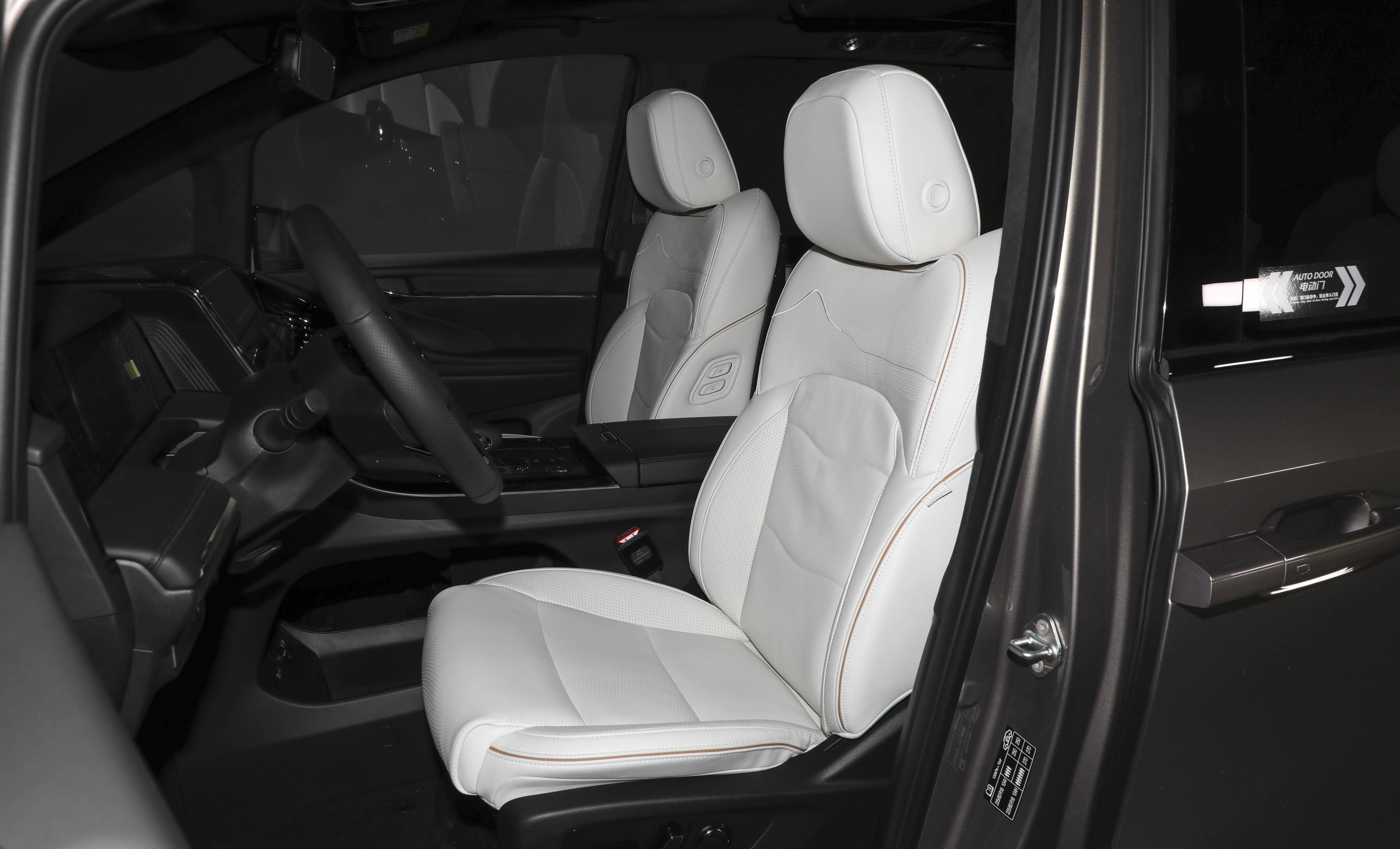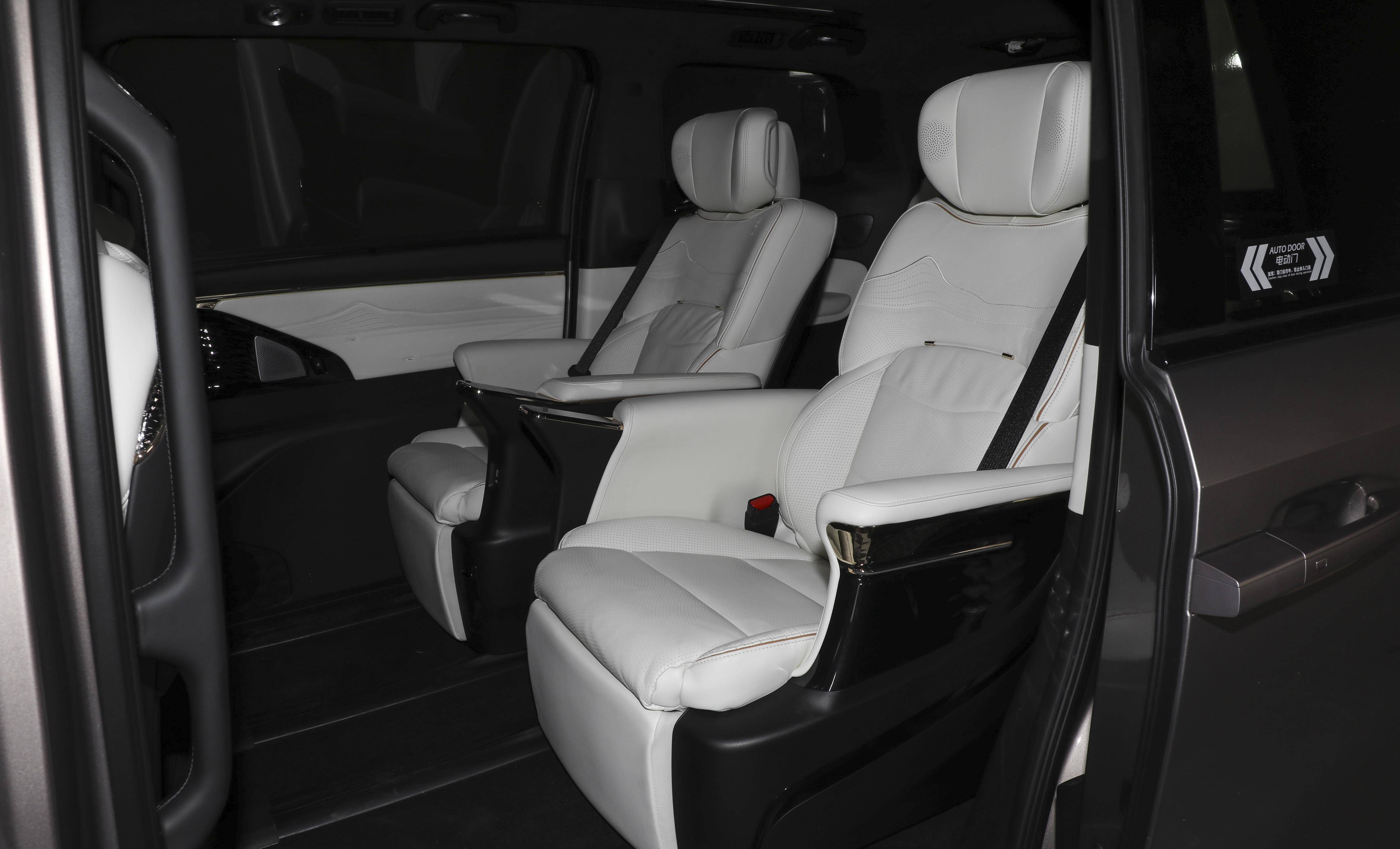 座椅部分采用2+2+3的七座布局,座椅设计方面基本与传祺M8保持一致,座椅采用真皮面料进行包覆,关键的第二排座椅除了常规的加热通风按摩功能外,还提供了头枕音响、后排娱乐屏等配置。