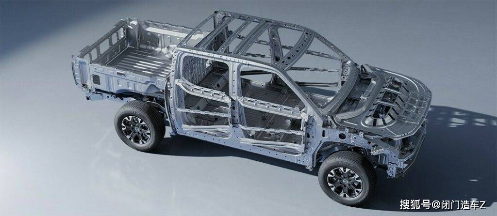 车身尺寸为5457x1971x1925mm,轴距为3260mm,配备了侧踏板、龙门架、车顶行李架,虽然是皮卡,但这样的配置增添意思越野的味道。
