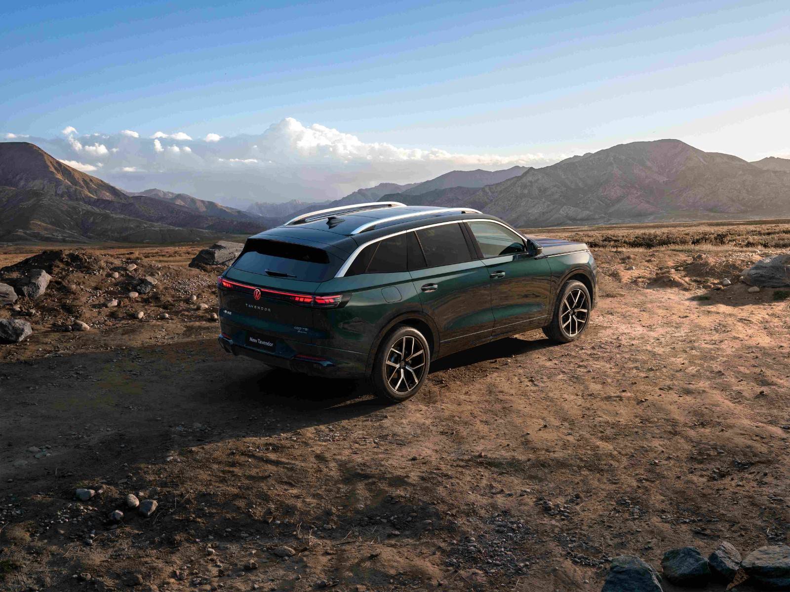 全新揽巡在外观设计上延续硬朗风格,车身尺寸达到5007mm×2015mm×1778mm,轴距为2980mm,更长的车身与舒展比例,让整车视觉更具力量感。前脸配备环绕式光带与纤薄大灯,搭配R-Line运动保险杠,发光LOGO与格栅灯形成贯穿效果,辨识度突出。侧面牛角式引擎盖线条、肌肉雕刻造型车身,搭配21英寸锋芒轮辋,兼顾运动感与空气动力学表现。尾部采用垂岩式造型与Surface立体渐进式尾灯,303颗LED光源实现动态流水效果,灯光交互更具仪式感。