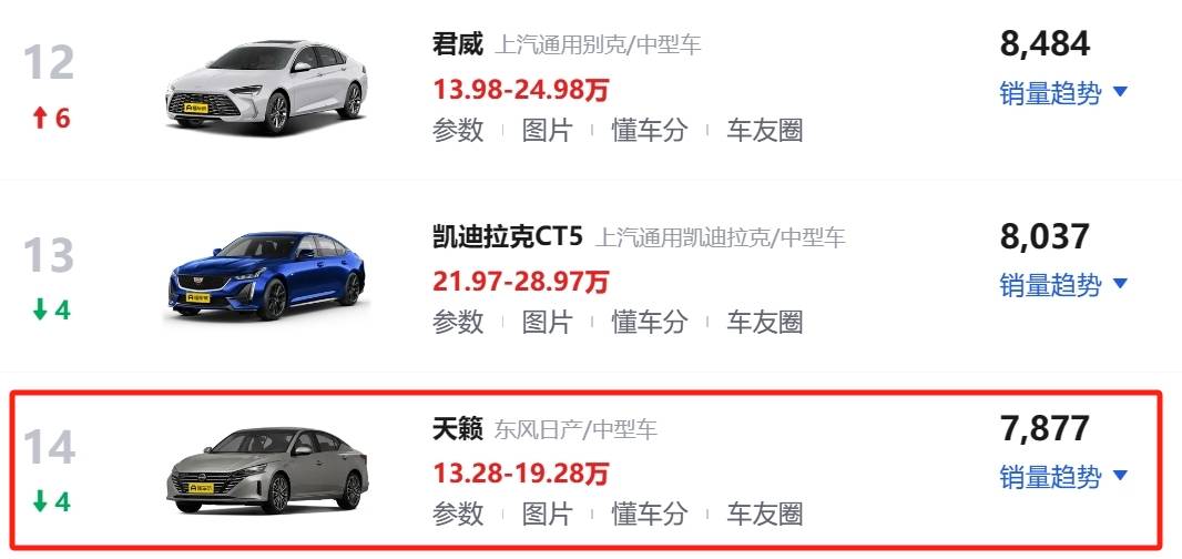 根据懂车帝的销量榜单来看,11月份天籁的销量为7877辆,已经跌出了中型车销量榜前十,与雅阁和凯美瑞拉开很大差距,甚至卖的不如别克君威。作为直接竞品,11月凯美瑞位列中型车销量版第一,卖了19783辆;雅阁位列第六,卖了14849辆,接近天籁的一倍。