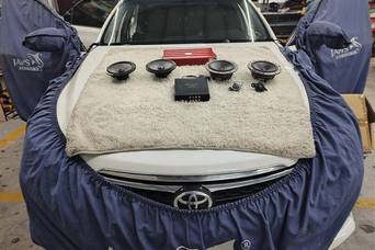 汕头汽车音响升级/丰田锐志音响改装瑞典DLS两分频+黄金声学VE406 DSP功放