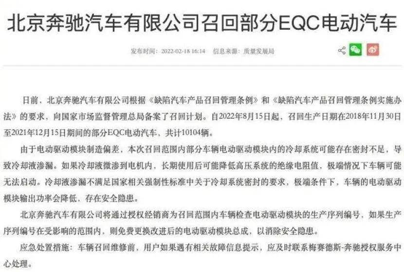 问题最大的,还是电机设计缺陷,奔驰EQC刚在国内开卖,就出现了因冷却液渗漏导致电机故障的问题,持续了非常长的时间,奔驰也一直是能推就推。最后是68位EQC车主组织起来集体维权闹了很久,奔驰才最终于2022年2月召回。伤了这一批最“忠实”的奔驰用户,既证明了“油改电”确实不行,也是奔驰电动化衰落的开始。