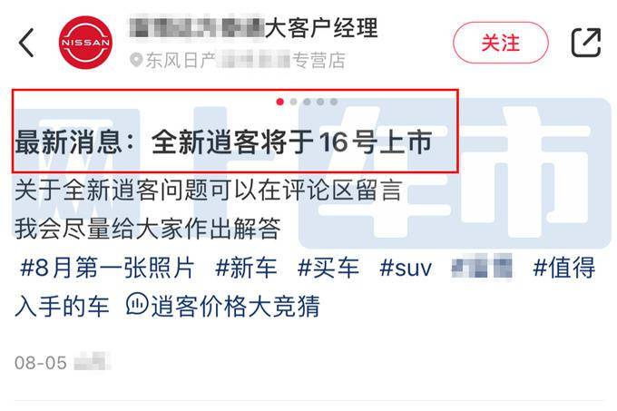 网上车市从东风日产经销商了解到,全新一代逍客将于8月16日上市。从东风日产工厂改造信息看,该工厂预留了P33B(全新逍客)和P32S(现款逍客)两个车的产能,这也意味着全新逍客会和轩逸及奇骏一样,采用新老同售的策略。