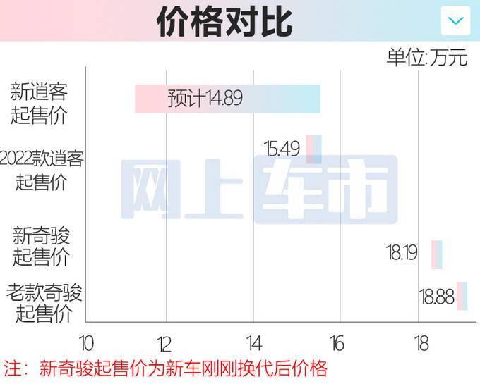 参考奇骏换代时的定价策略,预计全新一代逍客的官方指导价也将下调,入门版车型售价或降至14.89万元。