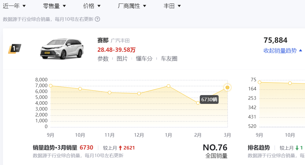 从零售销量来看广汽丰田赛那在近一年的表现确实令人瞩目,其零售量达到了75884辆,显示出消费者对这款车型的强烈兴趣。而今年3月份销量的大幅增长,更进一步证明了传祺M8在市场上的受欢迎程度。