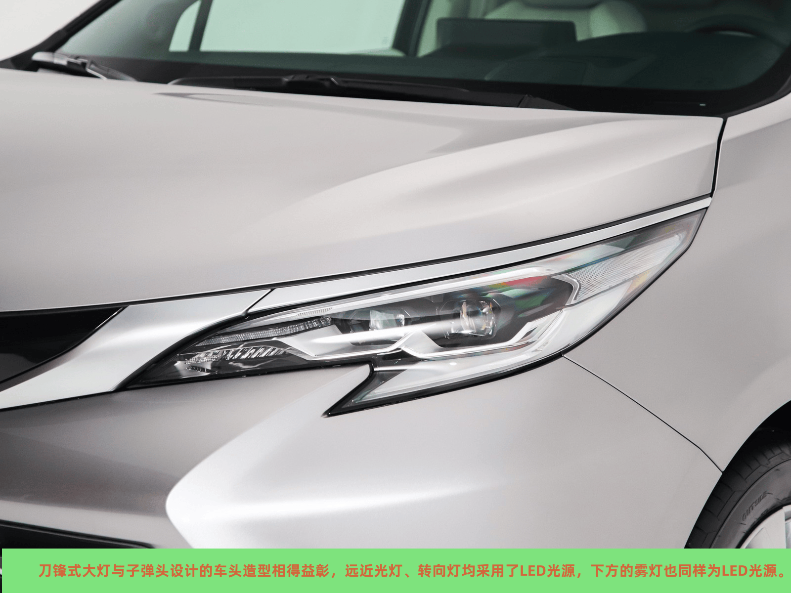 新款广汽丰田塞那延续了2023款赛那SIENNA的设计,车头造型气场强大。车头部分采用大量横向镀铬条进行装饰,凸显出车辆的精致感。正梯形进气格栅和大灯组的融合设计,不仅提升了车头的整体感,还赋予了车辆更加锐利的视觉冲击力。