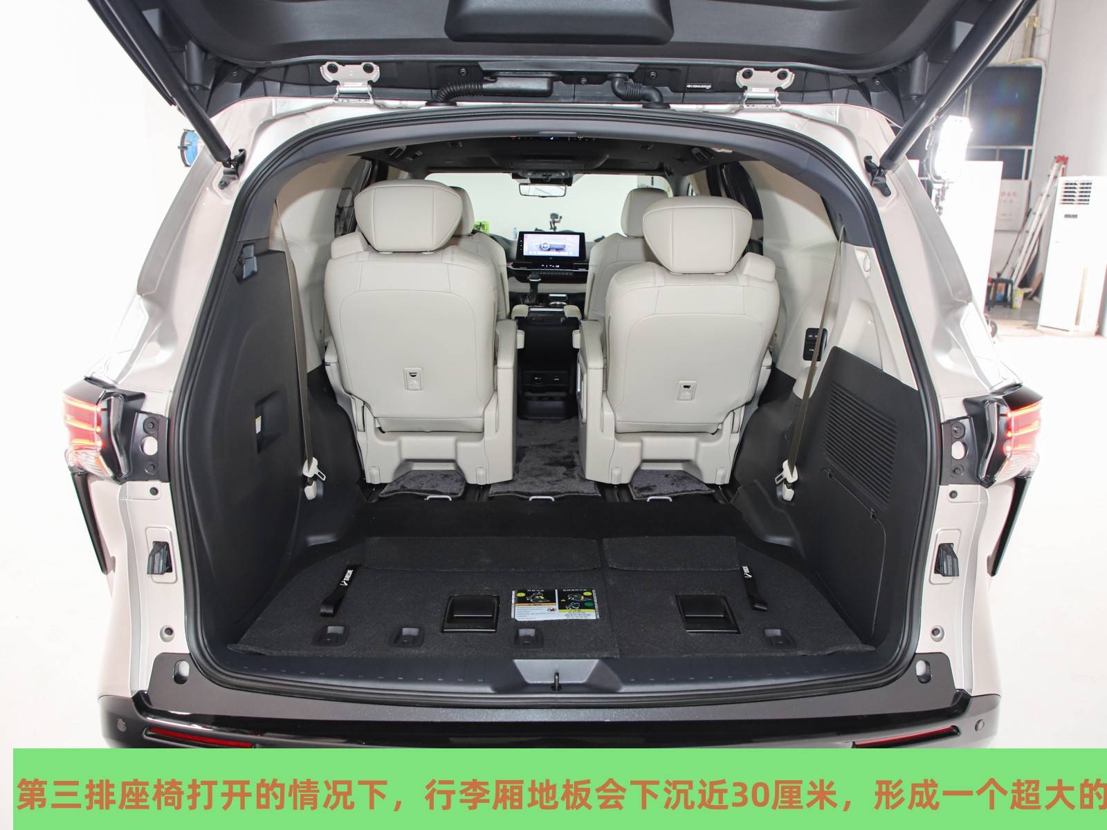 广汽丰田赛那的行李厢空间也是其亮点之一。在第三排座椅打开的情况下,行李厢地板会下沉近30厘米,形成一个超大的储物空间,这比许多家用SUV的储物能力都要强大,非常适合家庭出行。总体来说,广汽丰田赛那在内饰设计、座椅配置、空间利用以及舒适性方面都表现出色,充分满足了家庭用车的各种需求。