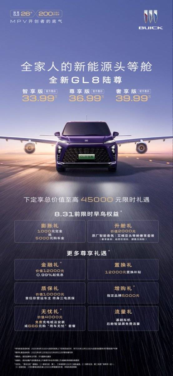 8月26日,别克品牌正式推出豪华新能源MPV——全新GL8陆尊。这款车共推出智享版、尊享版、奢享版三款配置车型,全系均为豪华艾维亚版本,售价区间为33.99万-39.99万元。