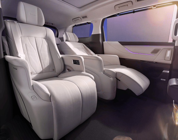 二排座椅升级为Nappa真皮羽感头等舱座椅,电动调节支持320mm超长行程,可通过一键VIP功能实现头等舱“云端模式”。二排座椅在原有靠背与坐垫加热的基础上,新增扶手和腿托加热,实现同级唯一的环抱式全域座椅加热。