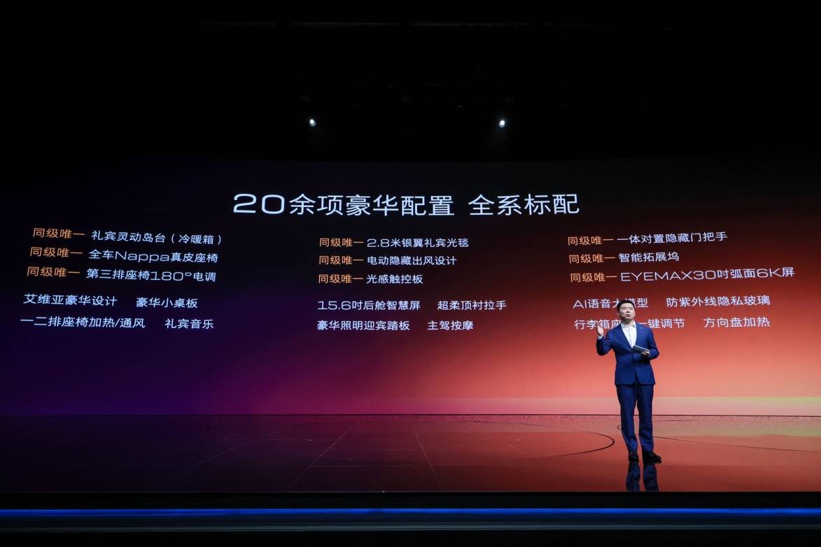 全系标配的20多项进阶豪华配置包括EYEMAX 30吋一体弧面6K屏、第三排座椅180度电动调节等。同时新增诸多实用配置,如方向盘加热、后排多功能拓展坞、行李箱一键调节二三排座椅等。