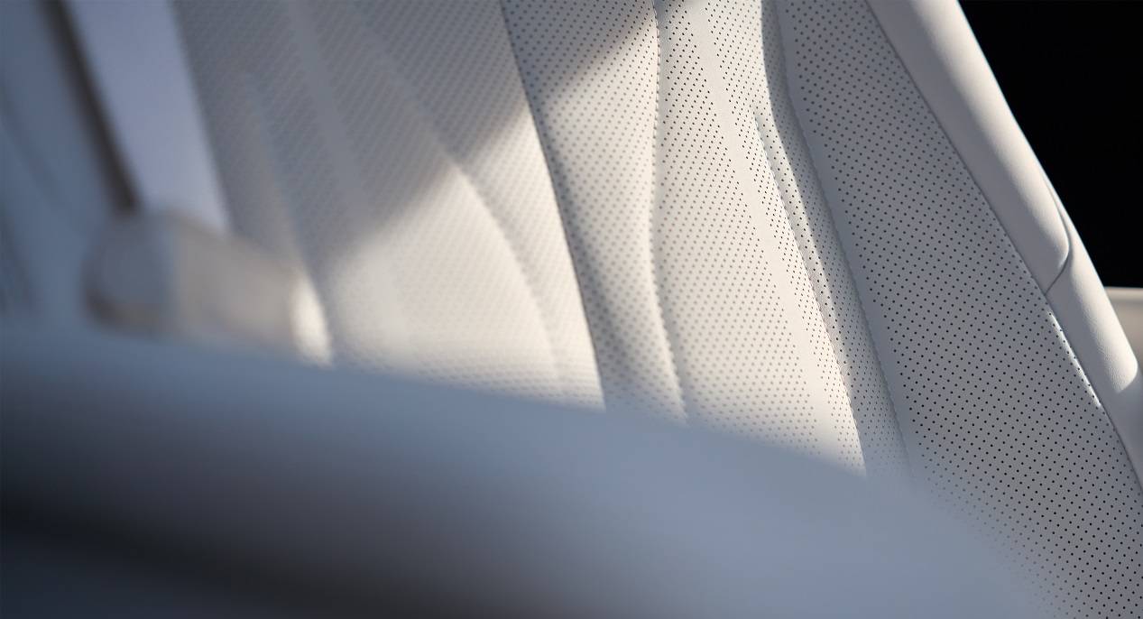 车舱顶部运用大面积超细纤柔麂皮绒面料,每平米超一亿根的绒毛密度确保了温润亲肤的触感。全车三排座椅皆使用北美超柔全粒面头层Nappa真皮包覆,触感细腻柔软。