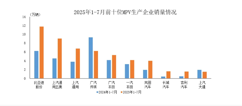 中国汽车工业协会8月21日发布的数据显示,2025年1-7月,中国MPV市场销量前十强生产企业共销售52.1万辆,占MPV销售总量的77.9%,MPV市场呈现出显著的头部效应。在这一市场中,比亚迪股份有限公司销量超10万辆位居榜首,上汽通用五菱和上汽通用分别排名第二和第三。