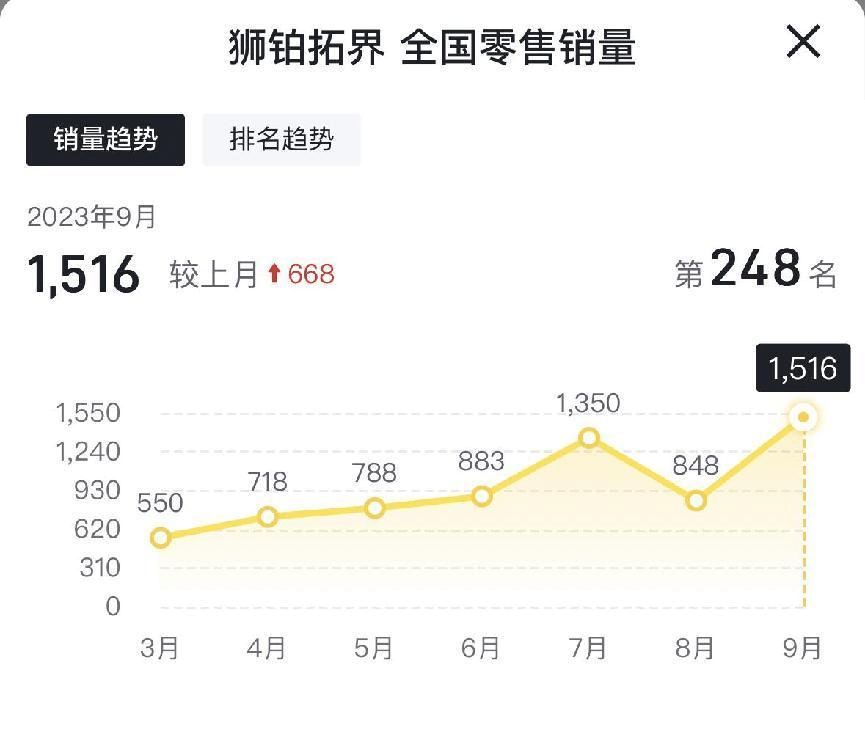起亚方面,起亚狮铂拓界直降3万元,9月份销量为1516辆,虽然总体来说销量仍然较头部热销车型有一定距离,但这也是狮铂拓界今年一阿里的最好成绩,相比8月份增长了78.77%。