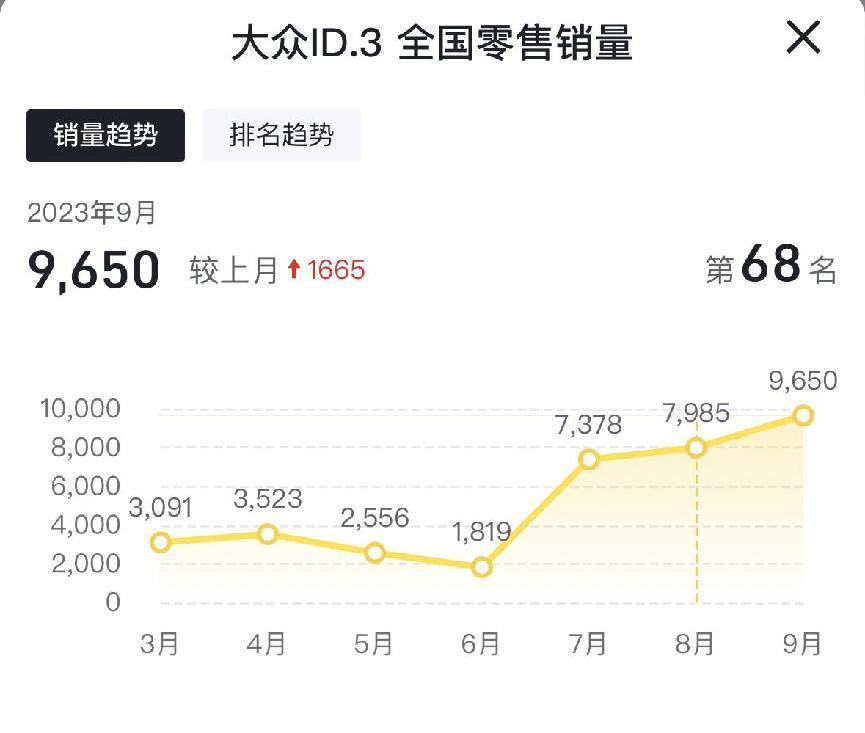 从销量来看,受“金九”的影响,ID.3此次促销效果颇丰,9月份取得了9650辆的成绩,为近年来的最好成绩。值得一提的是,在7月份的优惠之前,ID.3的月销量基本徘徊在两三千辆左右,今年7月份受降价的刺激,ID.3的销量已经一跃增长至7000辆以上。