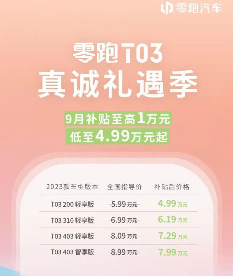 零跑汽车方面,9月初,零跑汽车就针对T03推出了至高1万元的补贴。相比于8月份而言,9月份,零跑T03的销量增长直接翻倍,达到了4402辆。