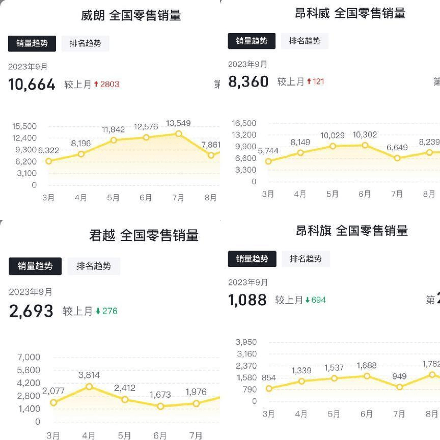 从降价的效果来看,得益于官方指导价从12.89万元直接降到7.89万元起步的威朗Pro,别克威朗在9月份10664辆的成绩,相比8月份增长了35.6%。而除了威朗Pro,其他车型的销量表现依旧较为平淡,降幅高达7万元的昂科旗,销量不增反减,再次下滑至1000辆左右。