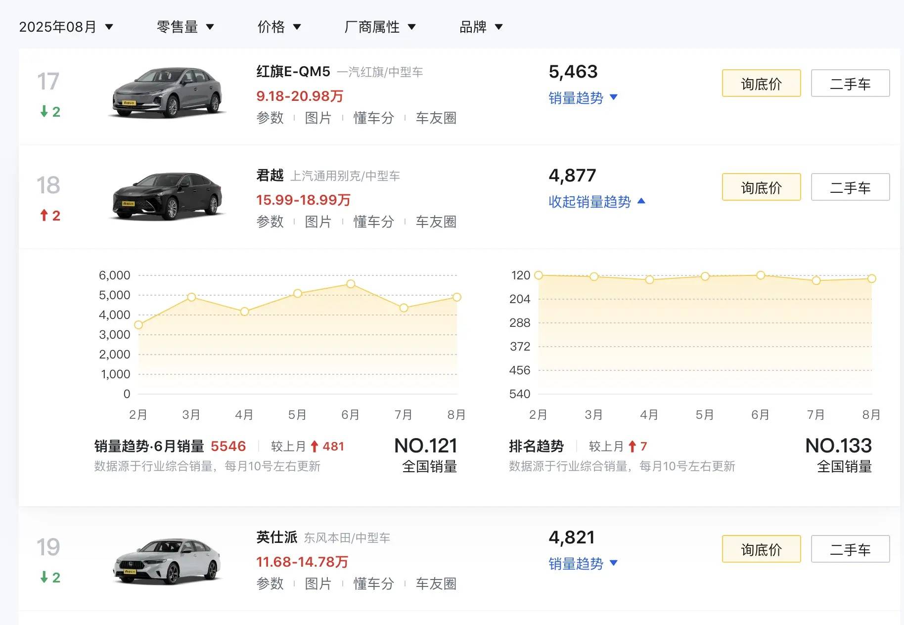 在合资燃油中型车细分市场,君越的直接竞争对手包括广汽丰田凯美瑞(指导价约17.18万-25.98万)、上汽大众帕萨特(16.45万-23.99万)、东风日产天籁(约17.98万-23.98万)等。君越在销量上表现稳健但并非领跑:今年8月销量为4877辆,当月在中型车榜单中排名第18位。君越自2006年面市以来已走到第四代,今年5月在浦东金桥基地下线的第130万辆车型,反映出其持续的市场积累。