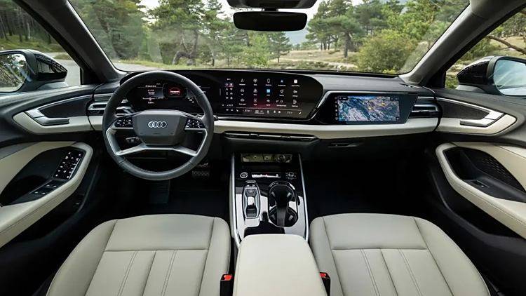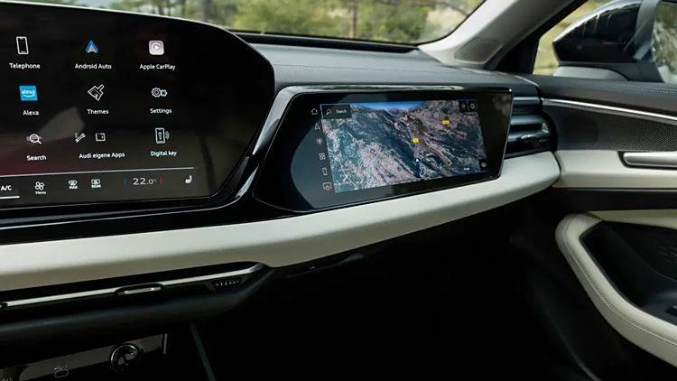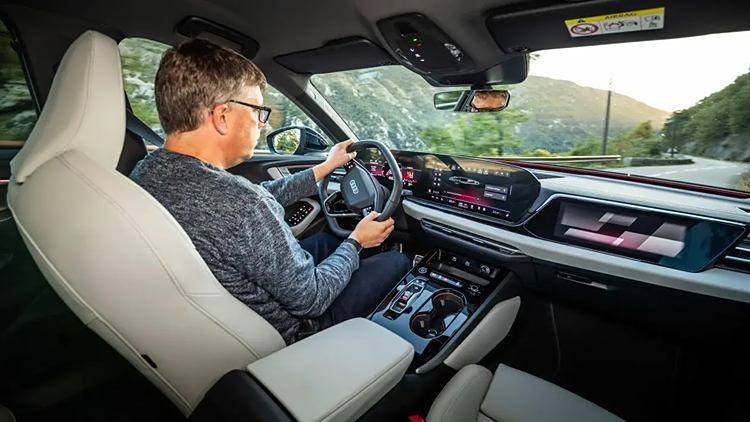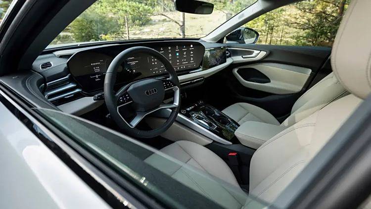 车尾的设计也继承了A5的设计灵感,但尾部设计的线条与A4的设计风格相似。尾灯的连续设计带有浮雕风格,虽然形状并不特别复杂,但其内部的照明效果十分出色,给人带来强烈的科技印象。后保险杠部分扁平的双边双出排气与扩散器展示了运动遗传特性。对于内饰而言,这款车型无疑采用了大家所熟知的新一代设计风格,其双联悬浮式大屏幕与副驾驶娱乐屏的组合在Q6 e-tron上已有展示,而Hud抬头显示部分也是紧跟其后,这使得它的科技水平与国内的竞争对手不相上下,方向盘也提供了多样的设计选项。普通版圆形四辐设计确实极具e-tron的魅力,呈现出了现代设计的风格。