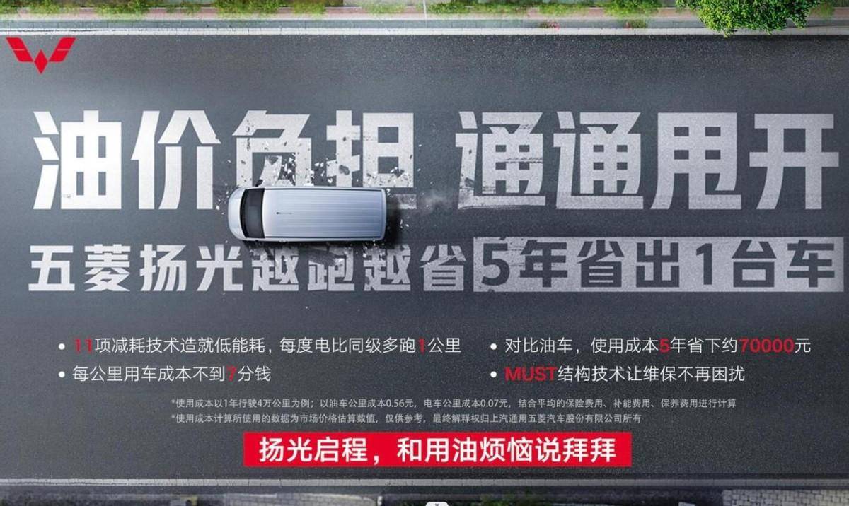 五菱扬光专为踏实勤恳的创富者而来,7.18万元起的定价直抵同级别燃油商用车价格,让用户买得起、用得省。据测算,若用户每年驾驶五菱扬光行驶4万公里,对比油车五年可省下约70000元(测算按油车公里成本:7L/100km*8元/L=0.56元/公里;电车公里成本:0.5元/度,0.07元/公里,结合平均保险、补能及保养费用进行计算)。