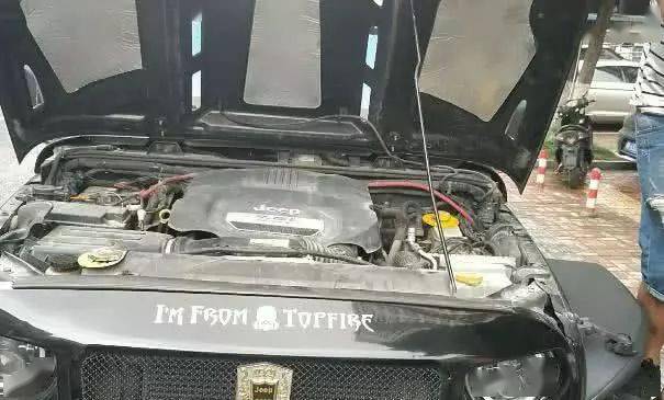 车主打开前大盖让我们看到了这辆吉普牧马人的引擎部分,在动力上此车搭载着3.6L 284马力 V6发动机,扭矩很大;匹配的是5档手自一体变速箱(AT),前悬为五连杆整体桥式非独立悬架,前稳定杆,后悬为五连杆整体桥式非独立悬架,带稳定杆,爬坡性能由此可见不一般。不过车主表示还是有点小遗憾的。