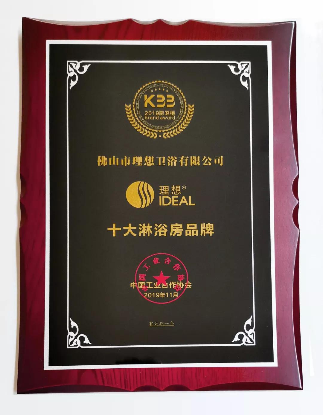 理想卫浴荣获“十大淋浴房品牌”荣誉!