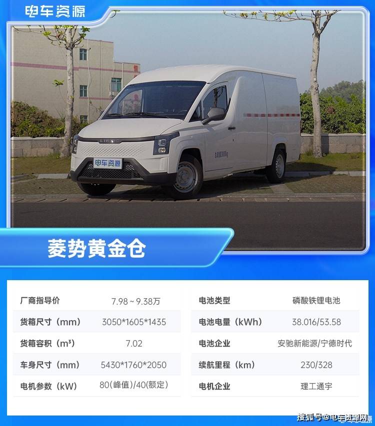 核心三电方面,菱势黄金仓共有两个版本,标准续航版搭载由安驰新能源提供的磷酸铁锂电池,电池电量为38.016kWh,工况续航里程230km,长续航版由宁德时代提供,电池电量为53.58kWh,工况续航里程为328km。两款版本车型均搭载由理工通宇提供的永磁同步电机,峰值功率80kW,额定功率40kW,最大扭矩240Nm。