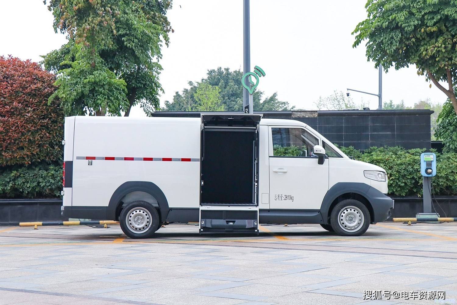 整车尺寸方面,精灵智蓝E7车身尺寸为5395*1780*1955mm,货箱尺寸为3010*1710/1660*1400mm,货箱容积为7m³,车身右侧设计有上下对开的侧门。