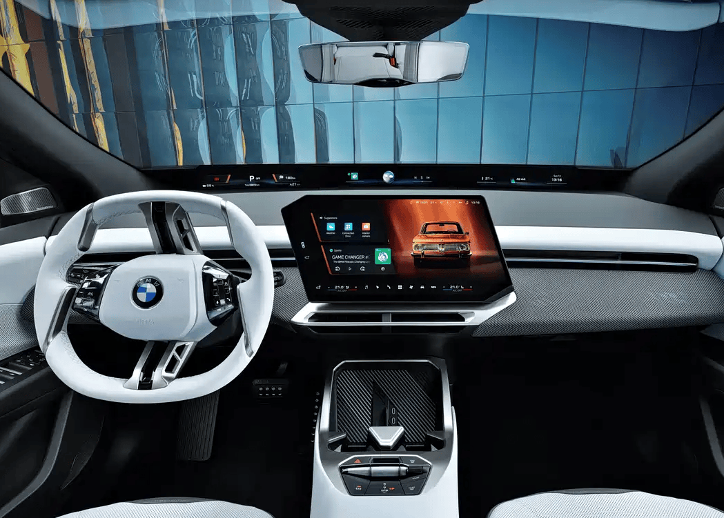 新车前脸采用突破性设计,标志性双肾格栅首次改为扁平化横向结构,与Vision Neue Klasse概念车设计语言同步,搭配一体化灯组更显科技感。灯组内部纵向日行灯带延续"天使眼"经典元素,分层矩阵照明系统则注入智能科技基因,前包围贯穿式进气格栅与导流槽设计,进一步强化低趴运动姿态。