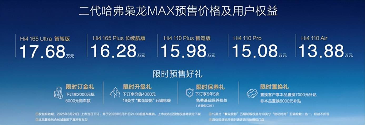 3月21日,备受瞩目的二代哈弗枭龙MAX正式开启预售,预售价格区间为13.88万元至17.68万元,共2种纯电动续航,5种细分配置,满足不同消费者的需求。