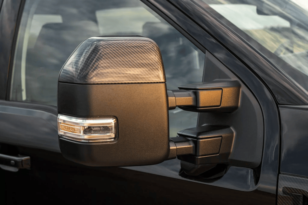 显然,对于这类大尺寸皮卡而言,靠复合材料减重不过是杯水车薪,因此这些碳纤维部件的设计纯粹为了颜值加持。具体包括全新发动机盖的碳纤维通风口、宽体轮眉、后视镜外壳,以及贯穿尾门的碳纤维装饰板。