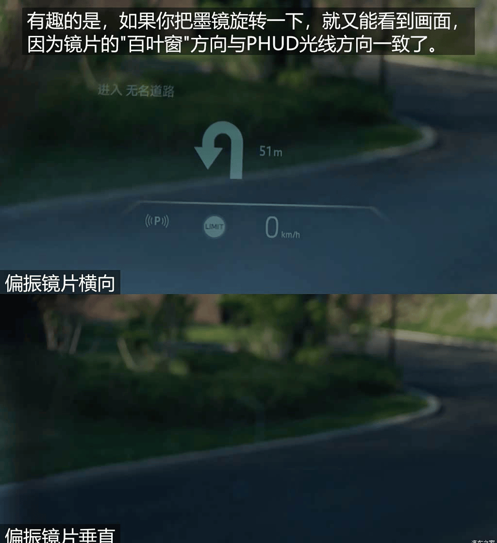 当然,你也可以去眼镜店定制一副偏振方向与PHUD匹配的偏振墨镜,但这样它就难以有效过滤路面反光了,也就失去了偏光太阳镜的主要功能。