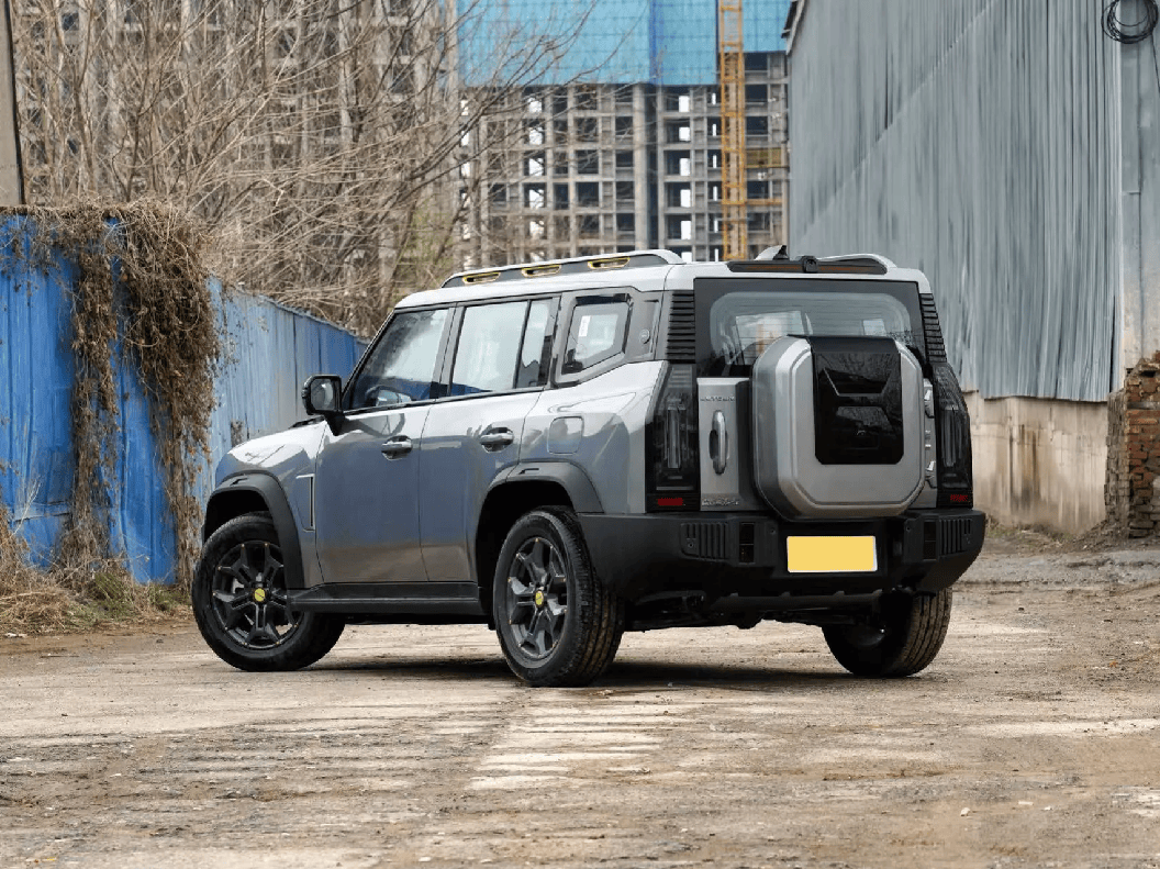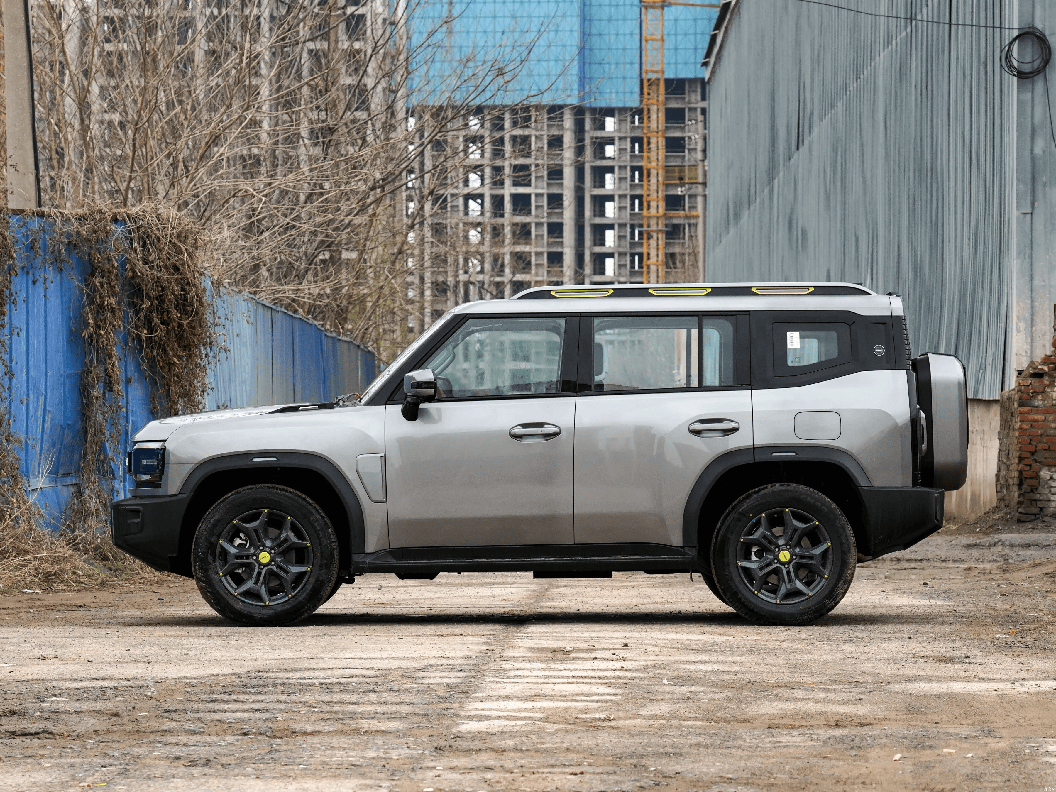 来到侧面,车身整体设计风格偏向硬派,与路虎卫士颇为相似。车身线条简洁流畅,轮拱处装有LED灯带,增添了科技感。车顶末端加入了银色行李架,提升了实用性。下方搭配了19英寸大轮毂,轮毂进行了熏黑处理,车轮选用AT型轮胎,进一步强调了其越野性能。