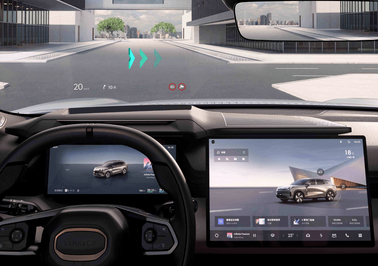 得益于芯片算力和国产系统的加持,领克08还配备了量产车中尺寸最大的92英寸无界AR-HUD,它拥有2K清晰度,可通过与TOF摄像头的眼球追踪联动,自动调节画面高度,更拥有10米成像距离的AR-HUD。要知道这种堆料程度,即便是最先进的手机也没有量产。