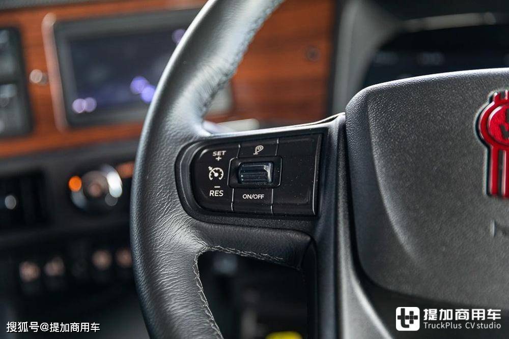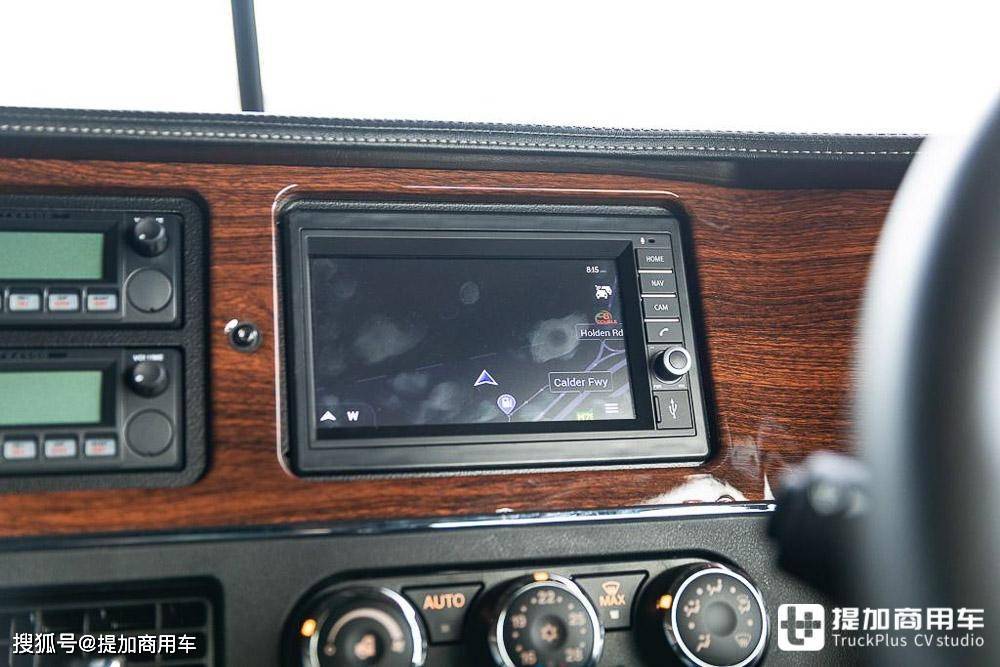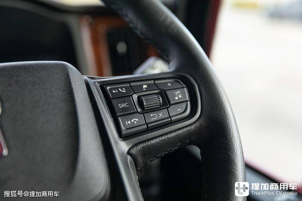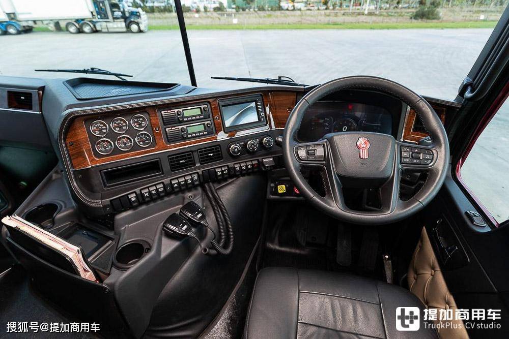 说完这些,接下来就看看车辆的内饰吧。虽然车辆的外观极其old school,但车辆的内饰也算得上是与时俱进。车辆采用了同步北美肯沃斯的最新款多功能方向盘、液晶仪表盘等配置,仪表台上带有木纹装饰,并且车门饰板、内饰侧墙等地采用皮革进行了包裹,将复古与新潮融为一体。