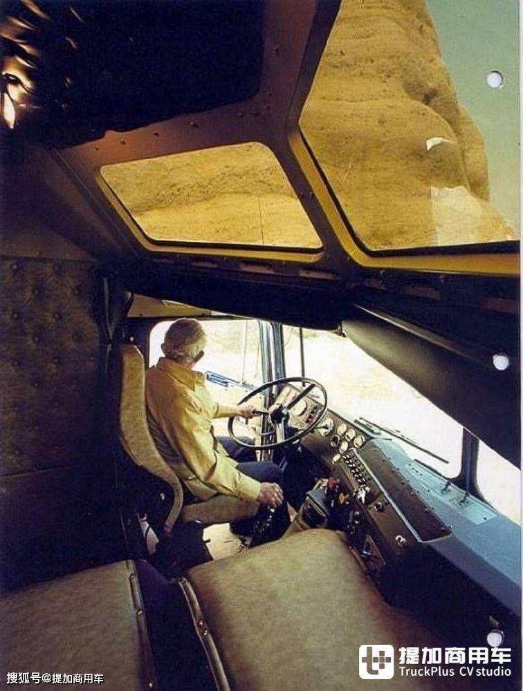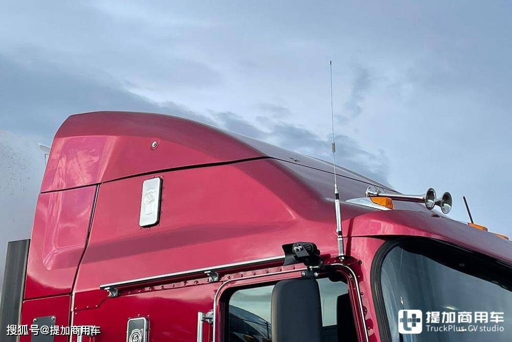 Vista窗户是个嘛玩意儿呢?上图中车顶那两个窗户便是了。1976年,肯沃斯为K100车型和W900车型开发了AeroDyne驾驶室,这也是全球范围内最早的加高顶驾驶室之一。为了更好利用高顶的空间,肯沃斯在高顶前方增添了两扇窗户,用来改善车内采光。这两扇窗户改善了驾驶室内的格局,并且在外观上极具辨识度,是非常经典的元素。在K220车型上,经典终究是为现实需求让步了。