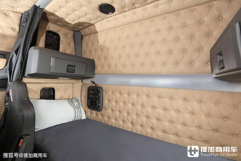 车辆采用2.3米长的高顶带卧铺驾驶室(2.3m Aero Roof Sleeper),从空间这方面来看,和沃尔沃提供的Globetrotter XXL驾驶室差不多。如果觉得2.3米的长度小了,还能选装更大的2.8米长高顶带卧铺驾驶室(2.8m Aero Roof Sleeper),带来更好的生活体验。在前方K220后面停着的卡车是经典款肯沃斯K104,它们之间有不少的相似之处。