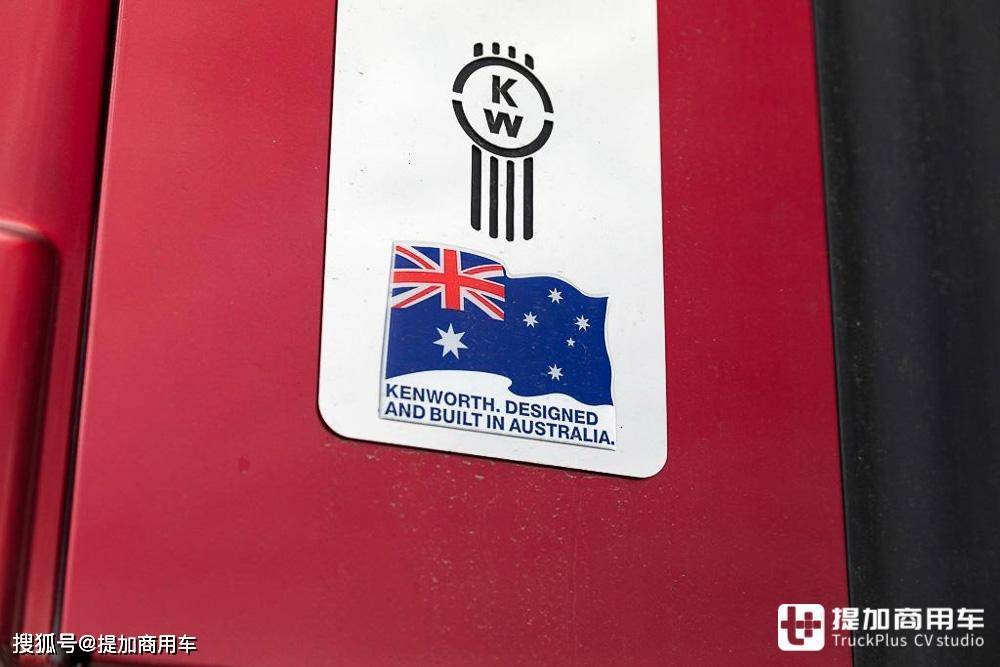 在肯沃斯英文全拼的下方还可见黑白肯沃斯KW车标以及小小的澳大利亚国旗,上面写着:肯沃斯,在澳大利亚设计和制造。
