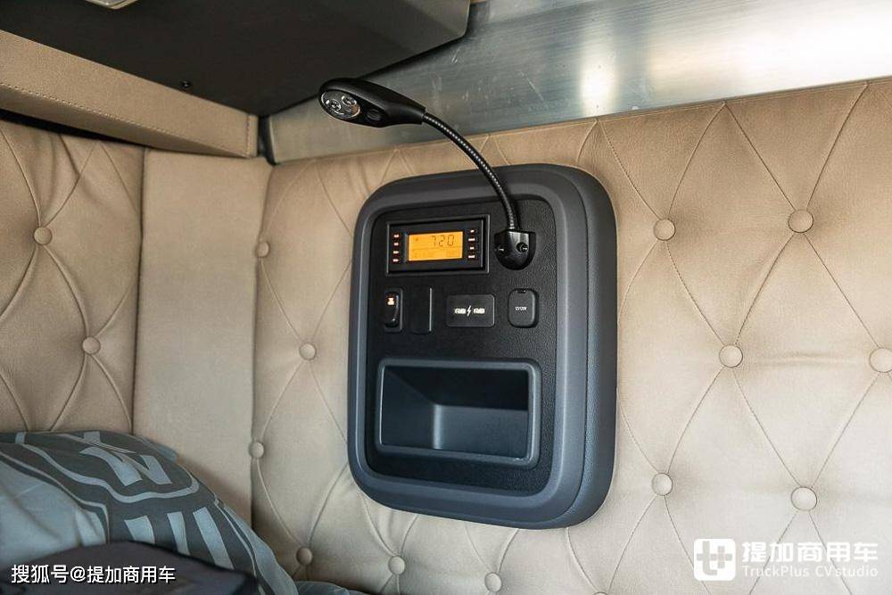 驾驶室后壁上固定有控制面板,上面带有阅读灯、储物槽以及电源插口等多种功能。同时,卧铺区域四周进行了皮质软包。