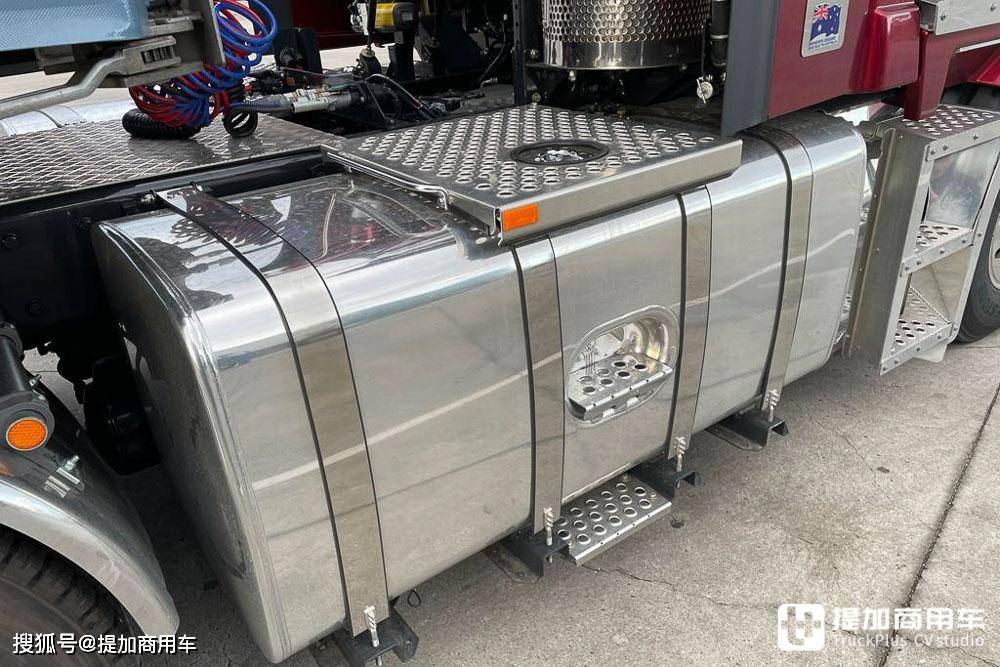 底盘左右分别配备了一个大容量抛光铝合金油箱,每个容量高达750升,全车共1500升的载油量,续航能力十分强悍。肯沃斯称,这款车型是B-Double运输以及公路列车运输的神器。油箱下方及侧面、顶部均设计有带打孔的登车踏板,更方便驾驶员工作。