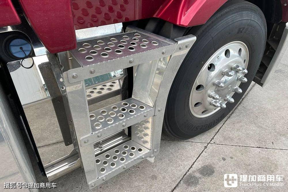 轮拱上方设计了带打孔的金属踏板,增强耐用性和防滑表现。在踏板侧面,亦镶嵌有肯沃斯的英文全拼车标。