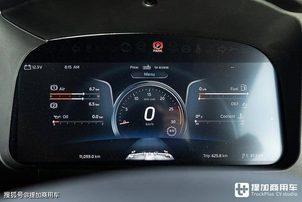 全液晶仪表盘内部的主题十分精致,上面显示了车辆的车速、转速、气压、水温、油温、油量等多种信息。并且,K220还搭载了Bendix Wingman Fusion自适应巡航控制系统、ABS、ASR、AEB、LDW等多种安全系统。不过可惜的是,一些新时代卡车该有的功能,这台K220还是没有。比如没有自动大灯,没有自动雨刷,也没有一键启动等花里胡哨的功能。
