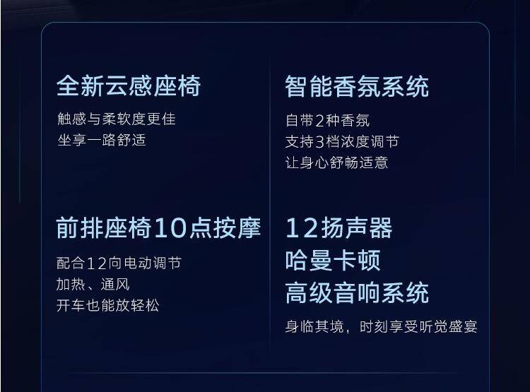 舒适性配置也拉满,Alcantara材质云感座椅不光有12向电动调节,还支持加热/通风/按摩,全车最多配备12个扬声器的哈曼卡顿音响系统。