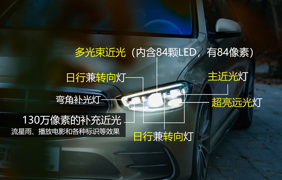 而像素式大灯(又叫智能数字大灯)是奔驰目前大灯技术的天花板!通过集成在车灯内部的Soc(芯片)+百万计的微反射器一起工作,可以提供比几何多光束更快速、更精确、更优秀的明暗照明变化,完全避免对向车辆和人的炫目以及最大程度提供更多的照明区域,除此之外,还具备了像素级的图案投射功能,比如这次车市的这款S500L以及马上要上市的新款奔驰E级均有配备!