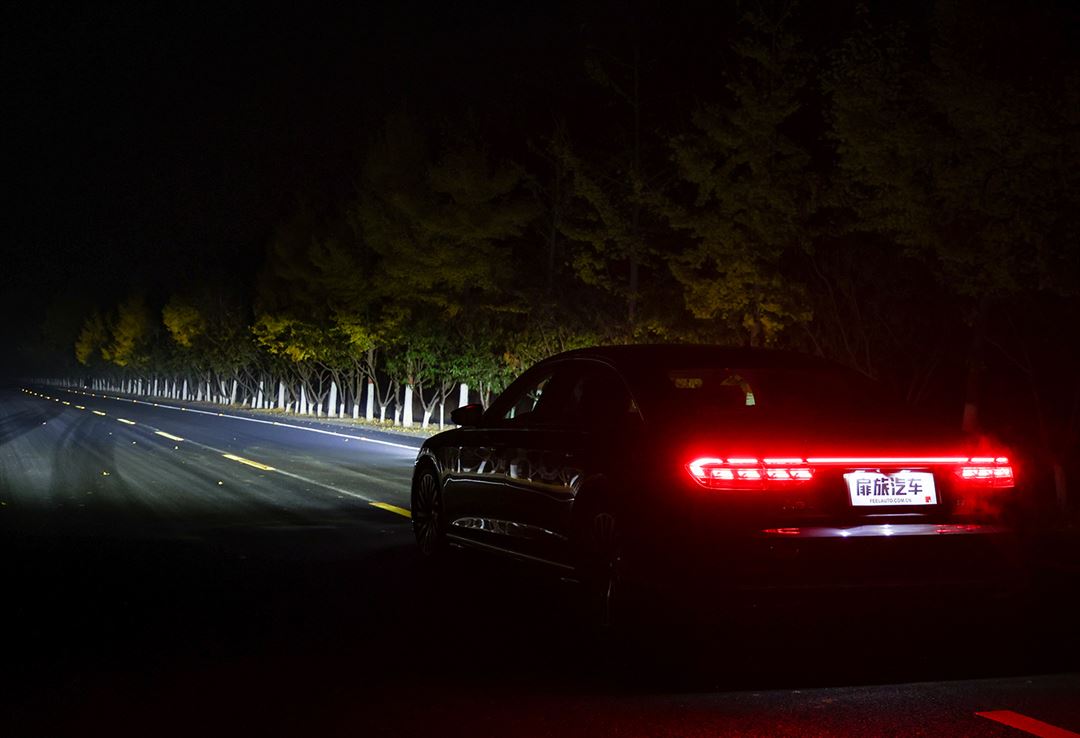 不过值得一提的是,A8L的近光灯横向照射范围非常给力,明显可以感受到它的横向照射范围很宽,另外就是尾灯实在太tm亮了,从上图可以看到,地面的一片红色反光!