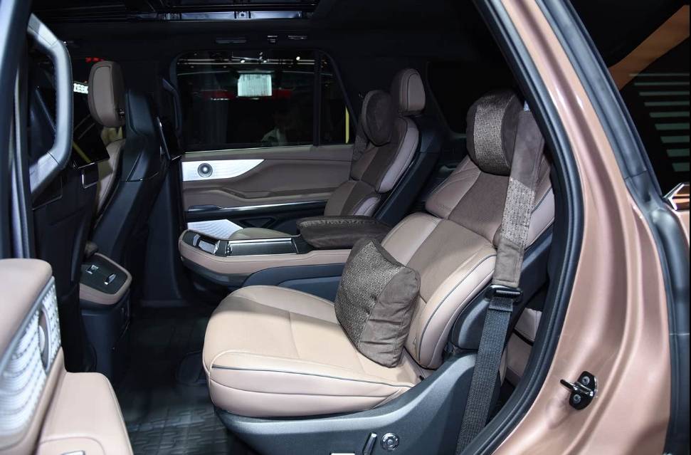 全新林肯领航员的内部采用全球首款48英寸4K环抱带鱼屏,相比现在流行的中控大屏,它的设计可以说是耳目一新。新车采用2+2+3的七座布局,前排领航座椅采用复式设计,主驾支持30向电动调节功能,并有加热、通风及按摩功能。二排座椅同样有多角度电动调节以及通风、加热和按摩功能,还可以一键电动俯仰功能,第三排的乘客进出更方便。第三排的空间也不小,腿部可活动范围足够大,靠背角度还支持电动调节,整体配置并不憋屈。它还有5层结构声学玻璃,超过40个声学包及ANC主动降噪,车内的静谧性很不错。